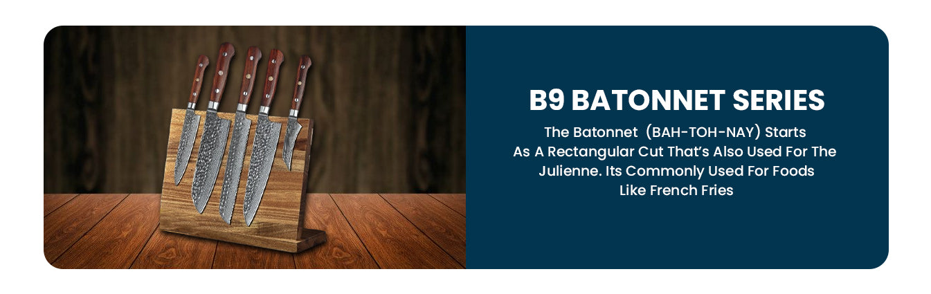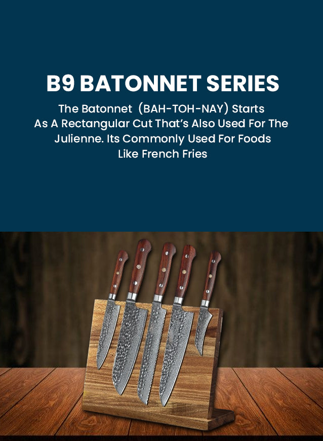 Batonnet Series 8 inch Damascus Steel Chef KnifeThe chef knife with the striking silver blade having a ripple pattern and a rich red Rosewood Handle is a must-have culinary item for chefs. The premium material and ergonomic design enhance its functionality; you can cut even the toughest ingredients effortlessly. The razor-sharp...