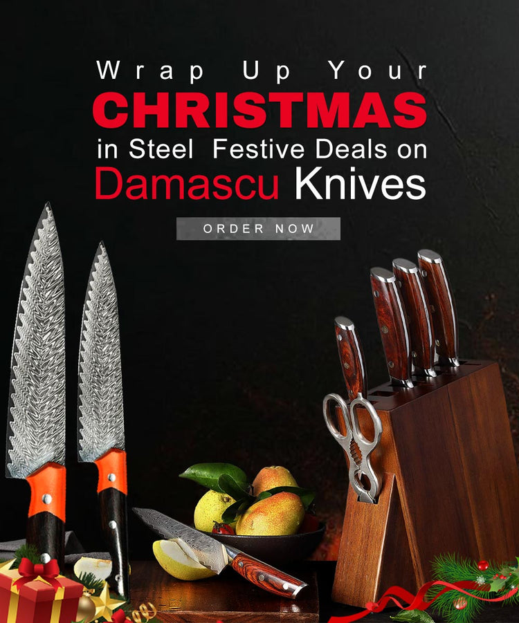 .Wrap Up Your Christmas in Steel with DskkBlade. Enjoy festive, limited-time deals on our finest handcrafted Damascus knives. Whether you're surprising a passionate home cook, treating a professional chef, or upgrading your own kitchen tools, our premium blades offer unmatched beauty, balance, and cutting performance. Each knife is forged with care, featuring stunning Damascus patterns and ergonomically designed handles that make every slice feel smooth and effortless. This holiday season, choose a gift that combines luxury, durability, and true craftsmanship. From chef knives to full kitchen sets, DskkBlade brings you the perfect blend of tradition and modern excellence—wrapped and ready for Christmas. Give a gift they’ll appreciate every day.
