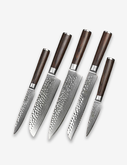 The 5-piece Damascus knife set is a must-have for every passionate and professional cook. This knife set comprehends 5 amazing quality products, including an 8-inch chef knife, a 7-inch Santoku knife, an 8-inch bread knife, a 5-inch utility knife, and a 3.5-inch paring knife. Professionals craft all these knives and have Ebony Wood handles that provide a comfortable grip and ensure seamless food preparation.
