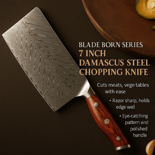 Get ready to meet our 7-inch Chopping Knife, an exclusive construction that has undergone precision and proficient artistry. If you are an ardent lover of art, marvel at the delicate craftsmanship of 67 Layers of Damascus steel, precision forged to create a corrosion-resistant and razor-sharp sword. The handle is made of rosewood and is luxuriously natural, among the triple rivets that give a hold for the expected control and comfort.