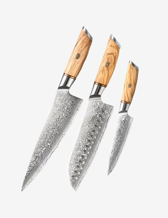 Here, you've got what you look for — it's the exclusive and stunning 3-piece Knife Set. Such poly handcrafted kitchen knives are made with the use of all four hands and with great inspiration. The present user will enjoy the Japanese-inspired accuracy of the 7-inch Santoku Knife when performing precise operations like slices of delicate vegetables and meats. As the last member in the trinity, the 5-inch Utility Knife is your best solution for peeling fruits, thinner cuts and trimming down to the most precise level.
