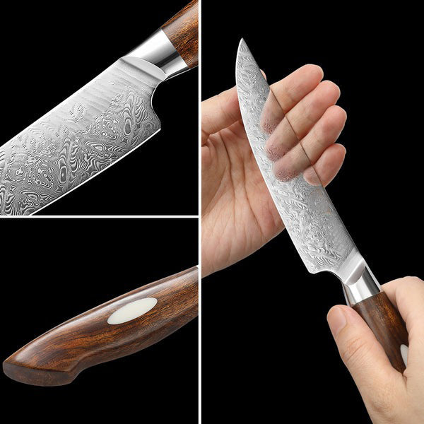 This knife offers a razor-sharp 5-inch Damascus steel blade for effortless slicing through meats. Its layered steel construction boosts edge retention and visual appeal. The full tang provides balanced weight and added strength.