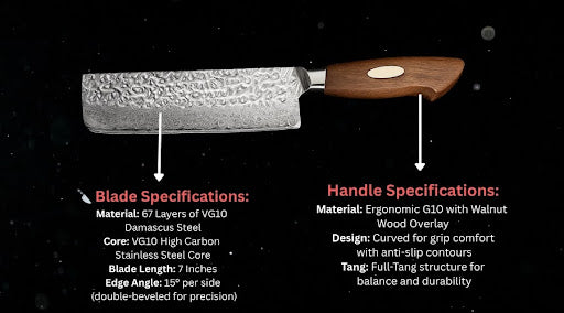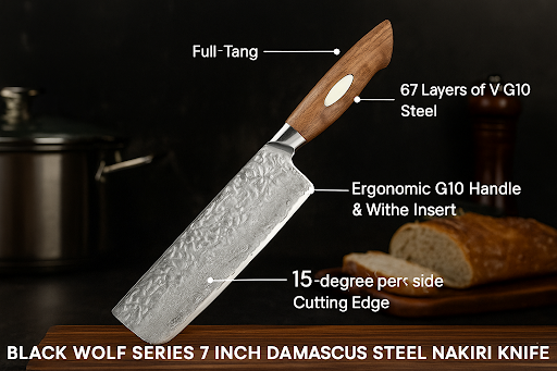 It is a true professional kitchen knife. The blade is forged from damascus steel. It is crafted for daily cooking use. This chef knife slices vegetables with clean cuts. It handles food prep with smooth control. The edge is strong and long lasting. This kitchen knife offers excellent grip and balance. The Black Wolf Series Nakiri Knife is sharp. The handle gives comfort for long use. It feels stable and safe while chopping. The design suits home and professional chefs. The culinary knife is not for self defense. It is made only for food cutting tasks. This blade is essential in every kitchen. It supports precise and safe cooking prep. This tool is built for cooking experts. Its bold look adds style to cookware.
