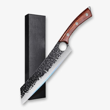 This hand-forged carbon steel knife looks absolutely stunning. The layered texture and polished edge make every cut satisfying.